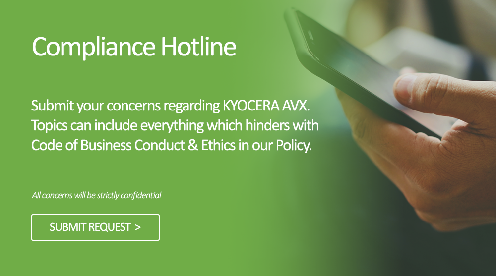 At KYOCERA AVX Components Corporation, we adhere to strict product compliance policies concerning the ethical sourcing of minerals, management of declarable and prohibited substances, and adherence to environmental regulations throughout our supply chain. We strive to exceed our responsibility in complying with legal, industry and customer requirements.
