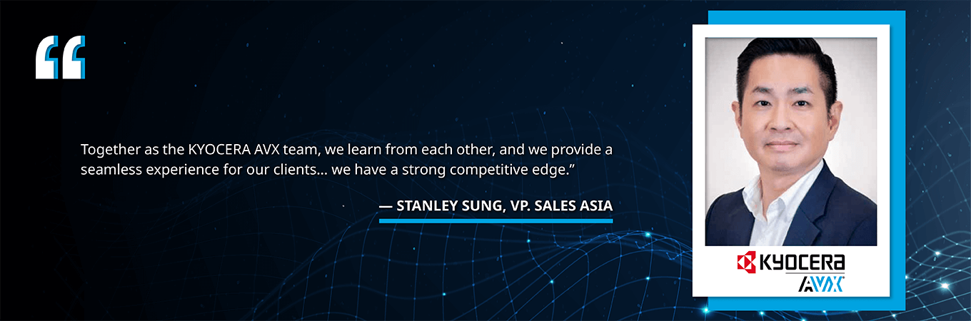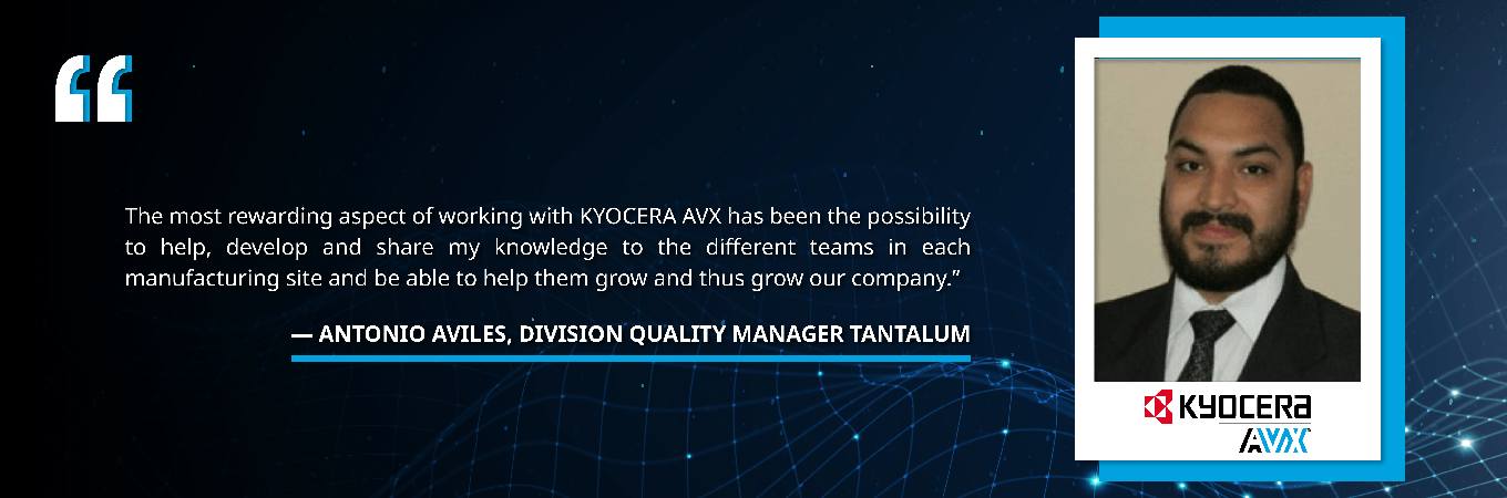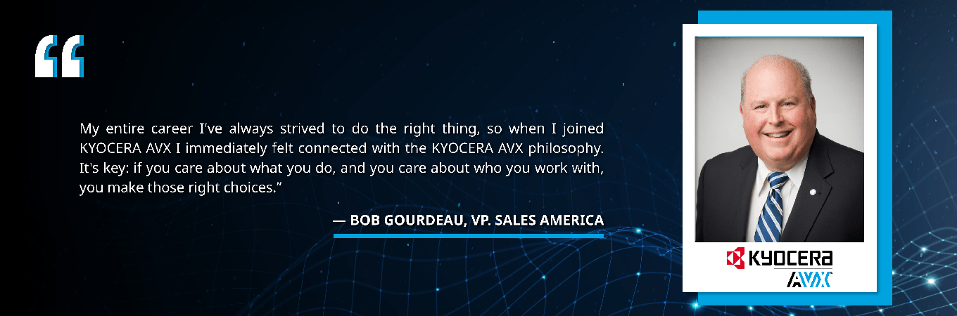 At KYOCERA AVX, we foster an inclusive environment where employees can reach their full potential. Focusing on key industries: automotive, information and communications, environment and energy, medical and healthcare: we work together with people around the world to address society’s most pressing needs, Now and In the Future. Using the power of technology, we create a better world.