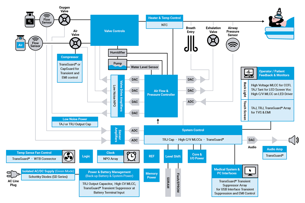 KYOCERA AVX provides a wide range of components that are critical to medical electronics in general and specifically ventilators. KYOCERA AVX NTCs measure gas and patient temperature. Tantalum & ceramic capacitors as well as schottky diodes are used throughout the power supply system that powers the pumps, motors, displays and control logic in ventalitors. TransGuards are used as transient voltage protection on interfaces, keyboards, touch screens and audio alarms.
