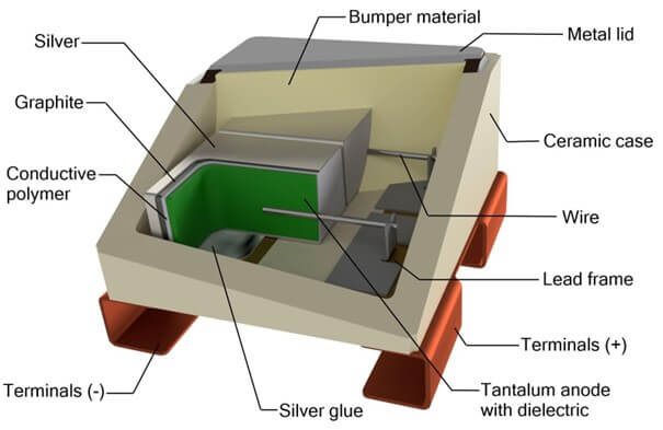 The construction of hermetically sealed tantalum capacitors is similar to that of standard SMD polymer tantalum capacitors, as shown in Figure 1. Each capacitor consists of a sintered pellet of tantalum powder with a very high surface area. The tantalum pentoxide dielectric is formed by applying DC voltage to pellets submerged in an acidic electrolyte, with dielectric thickness proportional to the applied voltage. The polymer cathode terminal is prepared either by in-situ polymerization or by depositing polymer dispersions. The most commonly used conductive polymer material is PEDOT (poly(3,4-ethylenedioxythiophene)), which provides strong contact with the dielectric, high conductivity, and temperature stability. Hermetically sealing these capacitors in a ceramic case prevents oxidation and humidity degradation of the polymer cathode.