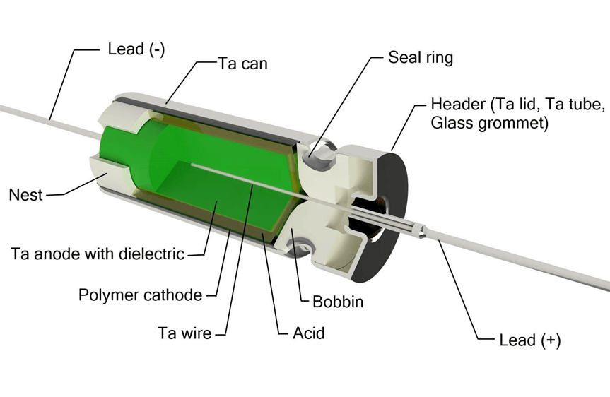 Similar to SMD polymer tantalum capacitors, wet tantalum capacitors consist of a sintered pellet made from pressed tantalum powder with a very high surface area and an embedded tantalum wire. This pellet serves as the positive electrode (the anode). A layer of tantalum pentoxide (Ta₂O₅) dielectric is created on the anode surface by applying a DC current across the anode in an acidic electrolyte. The negative electrode (cathode) includes an extremely high surface area material on the inner surface of a tantalum can, which is in contact with a liquid electrolyte. This electrolyte connects the cathode to the dielectric layer, forming the complete cathode. All components are contained within the can, which is hermetically sealed, with an external anode lead connected to the embedded anode wire and an external cathode lead connected to the can. An example is shown in Figure 2.