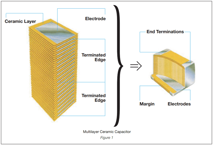 Multilayer ceramic capacitors (MLCCs) consist of a monolithic ceramic block containing two sets of offset, interleaved electrodes embedded within the ceramic dielectric. Two types of ceramic formulations are commonly used: Class I, which is temperature-compensating, and Class II, which is temperature-stable and suitable for general applications. The X7R dielectric is one of the most widely used Class II formulations, known for its capacitance variation within ±15% over a temperature range of -55°C to +125°C. In addition to temperature, the capacitance of Class II MLCCs varies with applied voltage and frequency (for more details on performance under various operating conditions, consult Kyocera AVX’s SpiCap software). [5] An example of MLCC construction is shown in Figure 3.