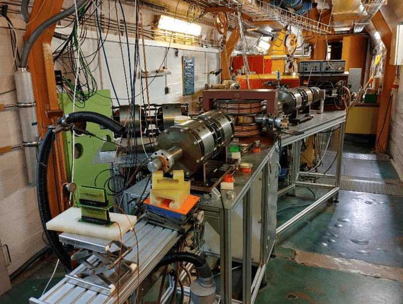 Unlike cyclotrons that produce protons, the microtron accelerates electrons, which are approximately one thousand times lighter than protons. Although electrons can be accelerated to high kinetic energies comparable to protons, their interactions with matter differ significantly due to differences in mass, charge, and behavior at the atomic level. The lower mass of electrons results in lower imparted energy on irradiated samples, primarily causing chemical changes without inducing nuclear reactions. Consequently, no radioactivity is imparted onto the device under test (DUT), making it easier to achieve homogeneous irradiation of the sample. The microtron also provides excellent control and configurability of the total radiation dose. [1]