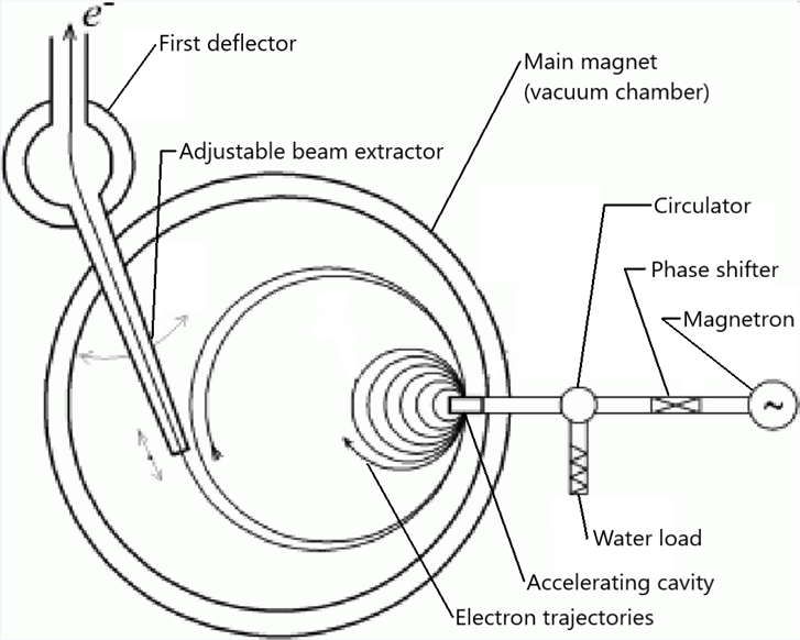 The MT25 is a cyclic electron accelerator with a Kapitza resonator, capable of energizing electrons in clusters at levels scaled by 1 MeV steps from 6 MeV to 25 MeV. The electrons are accelerated by an RF electric field of constant amplitude and frequency, in a uniform magnetic field. A schematic of the MT25 is shown in Figure 5. [7]