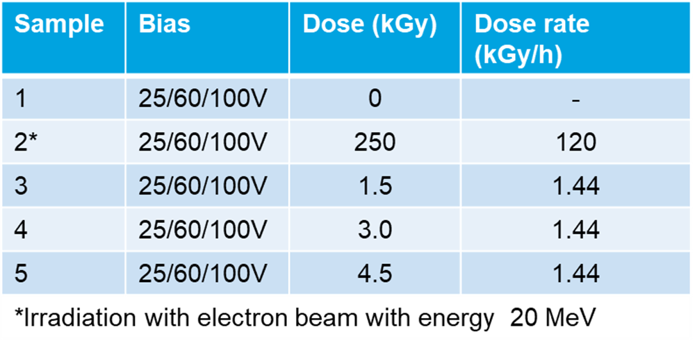 The extreme irradiation dose used an electron beam directly from the microtron, with an energy of 20 MeV and a dose rate of 120 kGy/hour.
