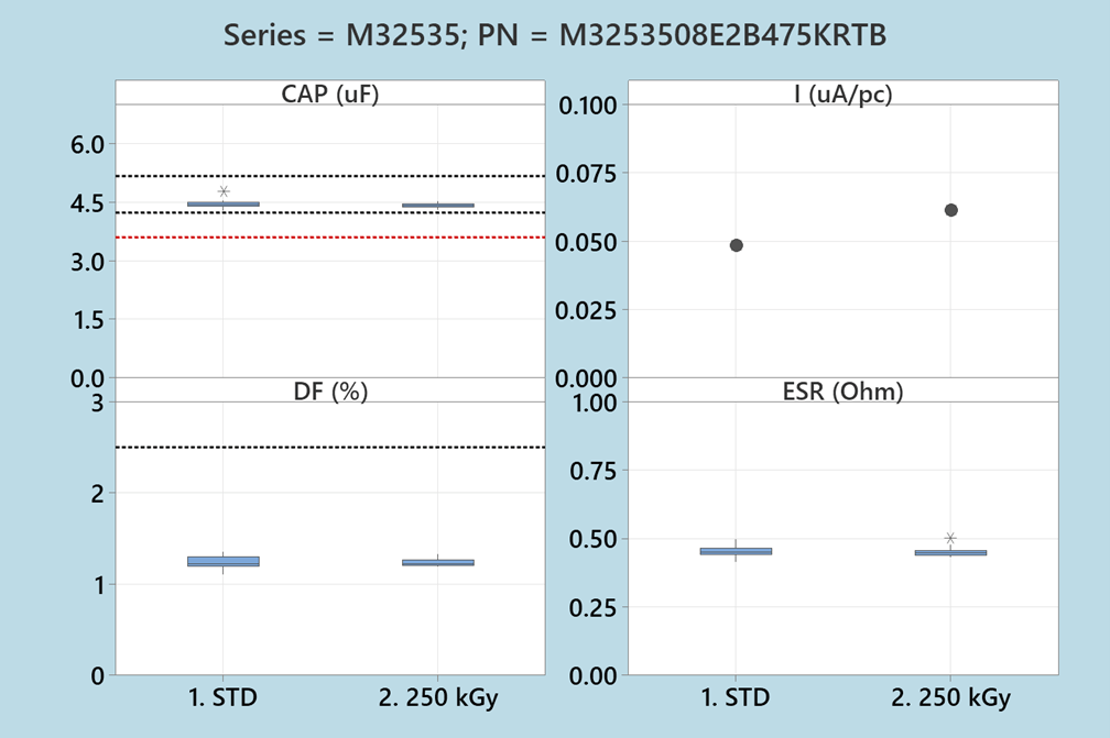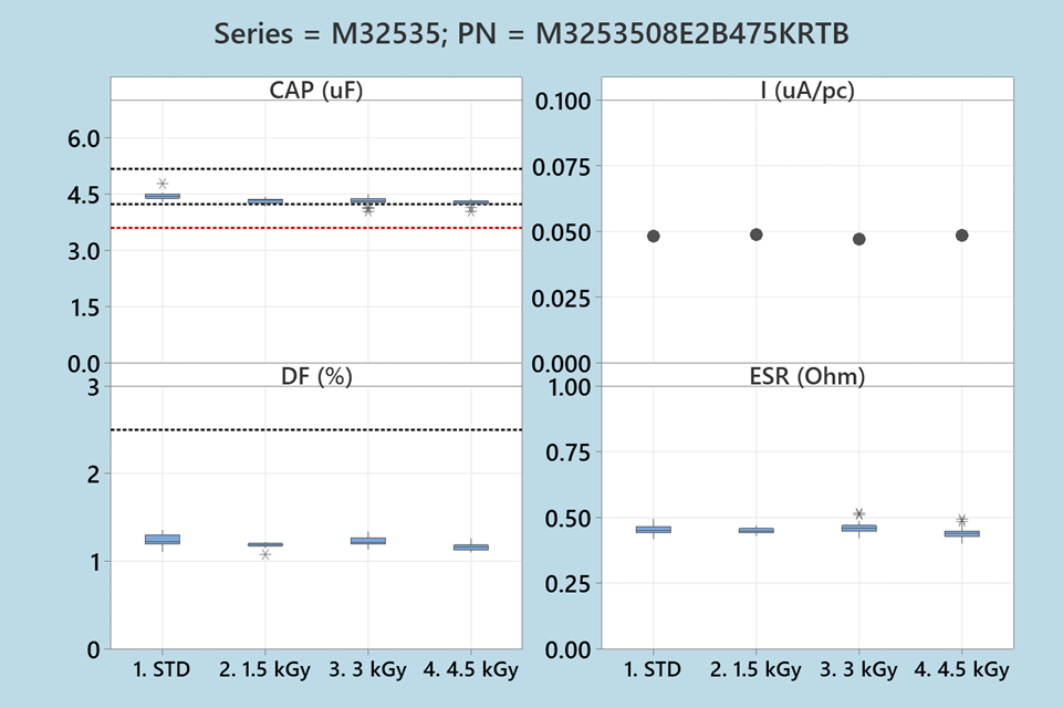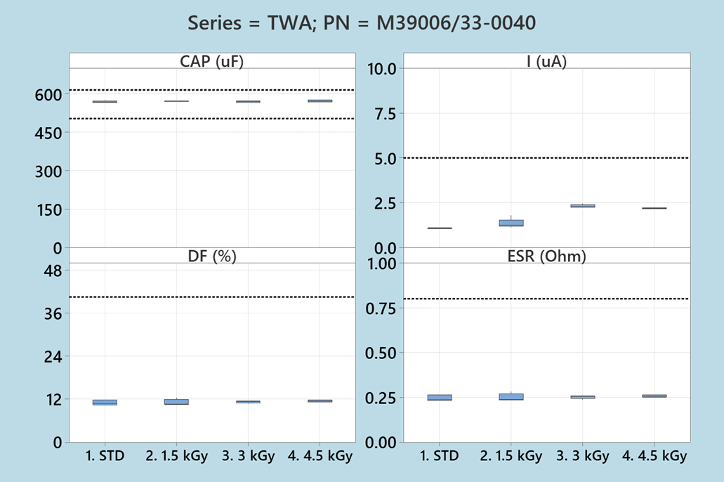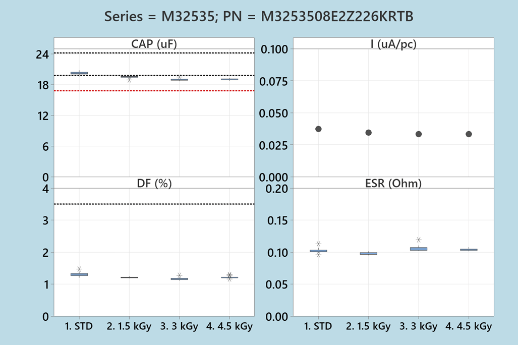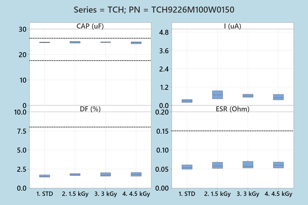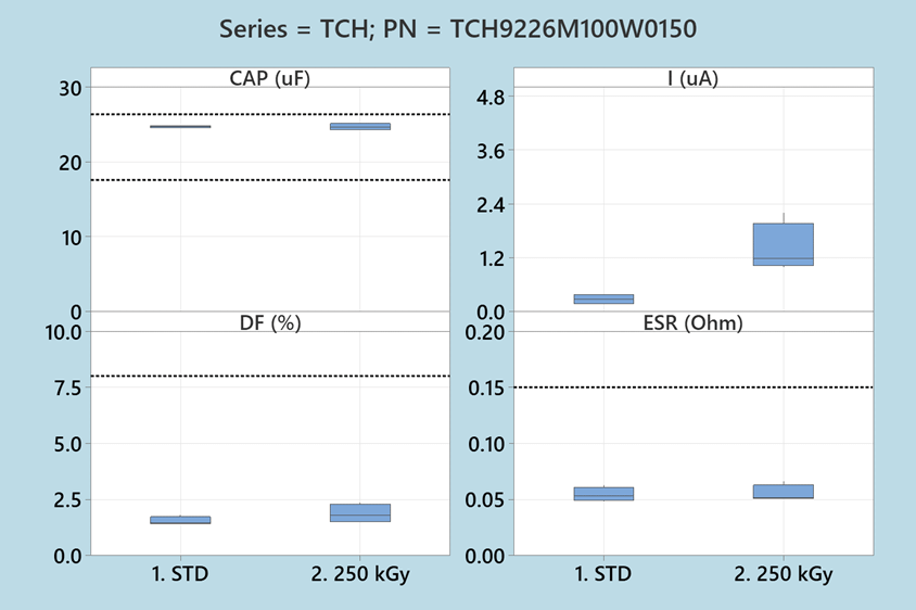 In a 2023 article titled Radiation Tolerance of Tantalum Polymer Capacitors, Kyocera AVX investigated the radiation tolerance of molded SMD tantalum capacitors with both conventional MnO₂ cathode and polymer cathode. In both cases, the capacitors showed excellent radiation tolerance in terms of capacitance (CAP), dissipation factor (DF), equivalent series resistance (ESR), and direct current leakage (DCL) after irradiation with a 20 MeV photon beam at a dose rate of 1.44 kGy, up to a total dose of 4.5 kGy [1].