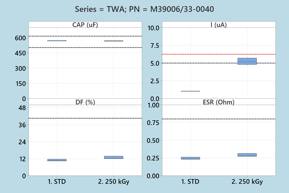 For the wet tantalum capacitors, the highest observed DCL increase from electron beam irradiation was from 1 µA to 5.1 µA, with some parts exceeding the initial specification limit of 5 µA. According to MIL-PRF-39006/33B, an increase of up to 125% of the initial DCL limit is permissible for reliability tests, which equates to 6.25 µA for this part number; this threshold was not exceeded (Figure 15).