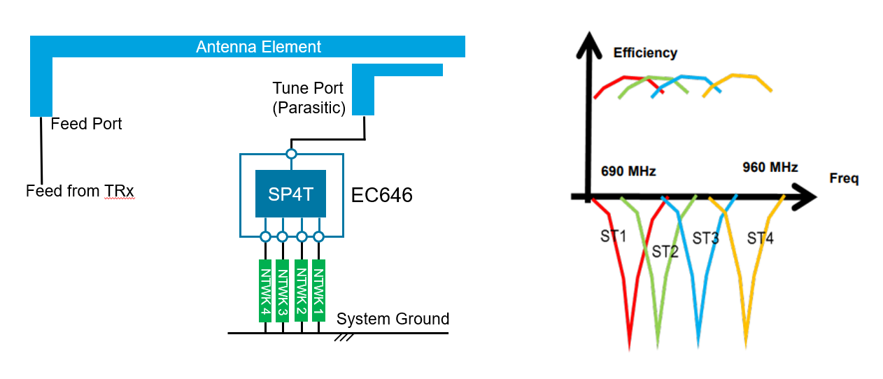 Using a shunt KYOCERA AVX EC646 RF switch will accommodate the antenna frequency response to shift to the lower or higher frequency, based on pre-defined matching circuit values. The chip provides a broader global band coverage with a single antenna element. It achieves this by using parasitic loading and active tuning techniques, especially to meet the stringent low band antenna efficiency requirements.