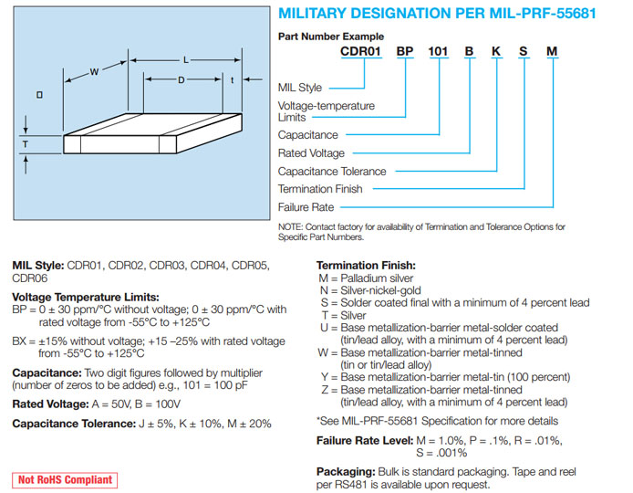 Military CDR products are qualified to Mil-PRF-55681 S- Level. These are MLCC capacitors with Establish Reliability for use where High Reliability components are required. The CDR01-06 ceramic capacitors are available in BP and BX temperature characteristics with termination options including Ag/Ni/Au, Pg/Ag, Solder Coated, Sn/Pb, 100% Sn.