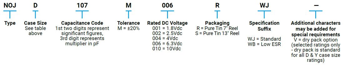 Five additional case sizes are available in the NOJ range offering low profile solid niobium oxide capacitors. Designed for applications where maximum height of components above or below board are of prime consideration, this height of 1.2, 1.5 and 2.0mm equates to that of a standard integrated circuit package after mounting. The S&T footprints are identical to the A&B case size parts and the W&Y footprints to C&D case size parts.