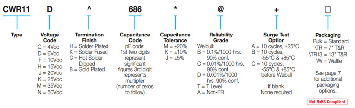 Fully qualified to MIL-PRF-55365/8, the CWR11 is the military version of EIA-535-BAAC, with four case sizes designed for maximum packaging efficiency on 8mm & 12mm tape for high volume production. This construction is compatible with a wide range of SMT board assembly processes including convection reflow solder, conductive epoxy or compression bonding techniques. The part also carries full polarity, capacitance / voltage and JAN brand marking. The series is qualified to MIL-PRF-55365 Weibull “B”, “C”, “D” and “T” levels, with all surge options (“A”, “B” & “C”) available.