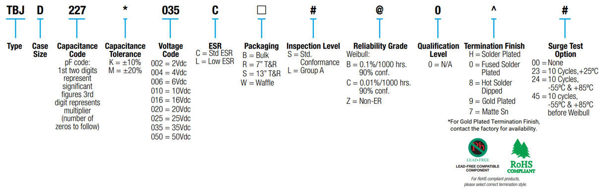 The TBJ COTS-Plus series, based on the CWR11 form factor, is a high reliability series encompassing the current range of EIA Low ESR ratings. These ratings are available with Weibull grading (B or C), surge current testing per MIL-PRF-55365 Rev. G (A, B, C), and optional Group A from MIL-PRF-55365.