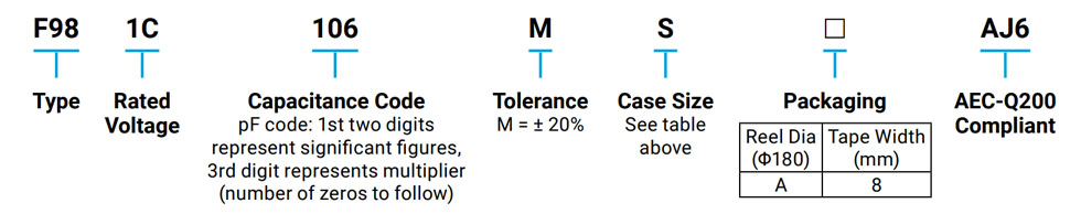 F98-AJ6 Series are small, SMD resin-molded chips in the automotive product range. The F98-AJ6 Capacitors are RoHS3 compliant to directive 2015/863/EU and AEC-Q200 and has small case sizes such as 0603 and 0805.