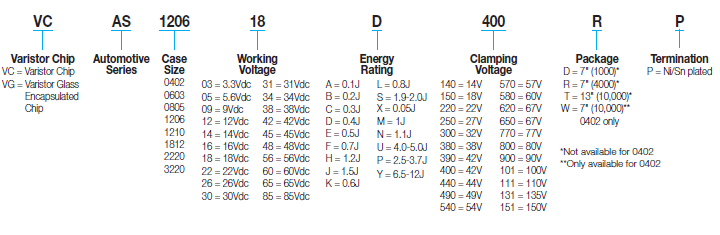 Available in case sizes from 0402 to 3220, working voltage from 3.3 to 85Vdc, energy rating up to 13J, peak current rating up to 2000A and load dump rating up to 25J. Operating temperature range is -55°C to +125°C with no derating. Parts offer excellent lead free solderability thanks to Ni Barrier/100% Sn termination however PdAg termination for hybrid assembly is also available upon request.